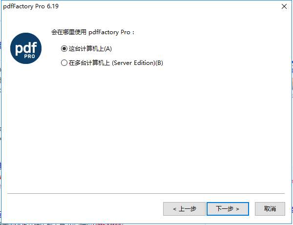 2、选择pdfFactory在一台电脑或多台电脑,如果您想在一台电脑上安装,点击【这台电脑上】,如果您想在多台电脑上安装,点击【在多台电脑上】,然后点击【下一步】继续。