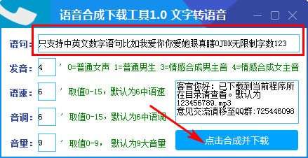 3、输入需要转换的语句,选择发音,语速,音调,音量等,点击合成并下载