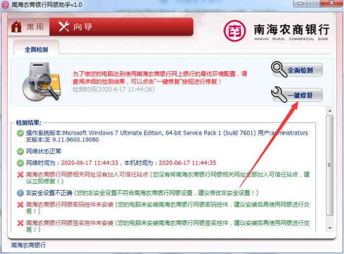2、检测完毕后,点击一键修复就可修复不正确的环境