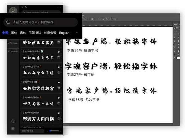 Fonts支持主流的文字处理软件、图片处理软件、设计软件、图文排版软件、视频特效软件点击快速换字,若快速换字失败,可在设计软件的字体下拉框内选择应用字体。