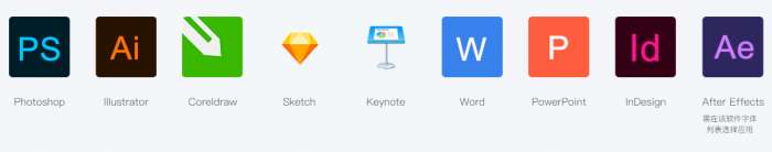 我们当前支持Windows平台的Photoshop、Illustrator、Indesign、Coreldraw、Sketch、Word、PowerPoint、After Effects,便于您在设计、影视制作、文档编辑、演示文稿等领域无忧使用字体。未来我们将开放更多软件的支持,为您提供全方位的服务和便利,如果您有在其他软件上使用的需求,请通过意见和建议向我们反馈。
