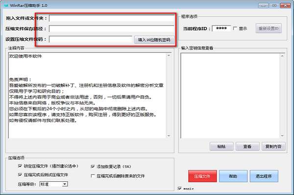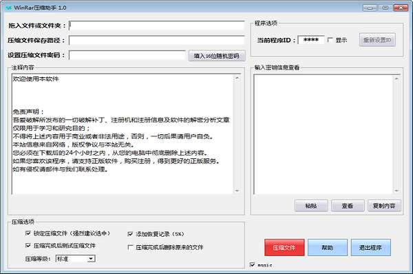 3、用本程序创建的RAR压缩文件,除了添加备注以外还会自动填入一串密钥。