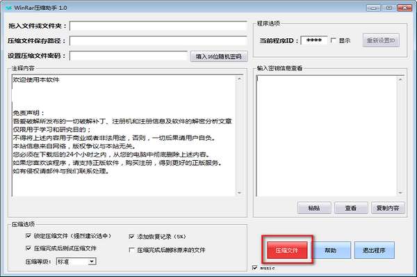 Winrar压缩助手是一款由网友制作的专门用于给RAR压缩文件批量设置压缩密码的压缩软件,利用软件能够快速的将自己文件压缩成RAR,并设置统一的密码。