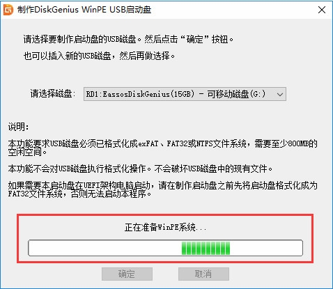 3、再次点击软件中的 工具-制作DiskGenius winPE USB启动盘,会得到图(1)提示。点击确定会提示“正在准备Win PE系统”如图(2)所示。创建完成之后会出现如图(3)的提示。这样含有DiskGenius的WinPE USB启动就制作完成了,在需要启动的电脑上设置本启动盘为第一启动项,就可以进入WinPE版的DiskGenius软件了。