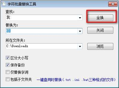 字符批量替换工具 一键盘同时替换.txt .ini .bat三种格式的文件内的字符