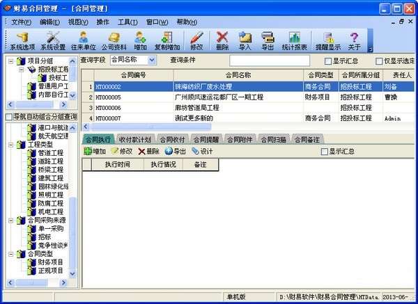 财易合同管理软件从合同起草、合同签订、文本管理、结算安排、执行进展、合同变更、到实际结款以及对合同结款情况统计分析的全方位管理主要功能点:分为合同执行,合同收付,合同提醒,合同备注,往来单位管理,商品资料管理,基本资料及系统设置等。财易合同管理软件是目前国内性价比最高的,最好的合同管理软件,相比同类型软件具有界面美观大方,功能强大而操作简单,自定义功能特别强大,是目前国内唯一一款提供超级强大自定义功能的合同管理软件。