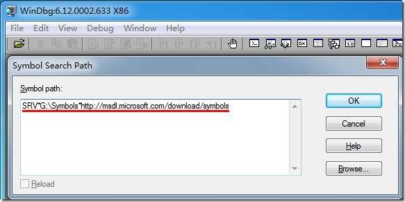 2、在弹出的windbg符号表设置窗(symbol path)中将符号表地址:SRV*C:Symbols*http://msdl.microsoft.com/download/symbols粘贴在输入框中,点击OK即可。