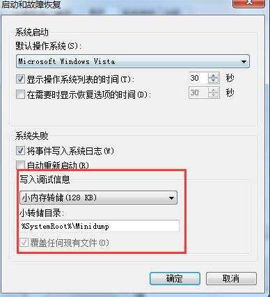 3、最后在打开的这个“启动和故障恢复”弹框中在“写入调试信息栏”中选择小内存转储,再将小转储目录为%SystemRoot%Minidump(蓝屏文件存放位置),即为C:WindowsMinidump文件夹。如下图所示,设置完成点击确定即可。