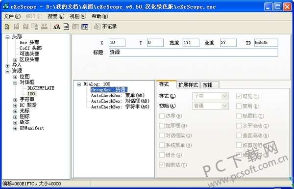 eXeScope是一款功能强大的exe程序。能修改exe程序中的字体、菜单位置、对话框排序、字符串、图片资源等,支持exe、dll和ocx文件,可直接修改vc++及delphi编写的程序。PK下载网为您提供eXeScope绿色版下载,欢迎前来下载。