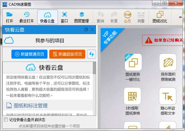 2、打开软件后vip功能可以直接使用,其他灰暗的需要打开图纸后才能使用。