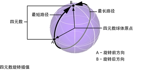 四元数将提供动画旋转的平滑插值,与 Euler 角度相比,四元数总能在关键帧之间产生更为有效的路径。四元数将存储对象的总方向,而并非一系列的独立旋转。这意味着一个四元数存储的旋转数据量与三个 Euler 角度存储的量相同。因为四元数仅存储方向值,所以可用于计算一个方向到另一方向的最短旋转。