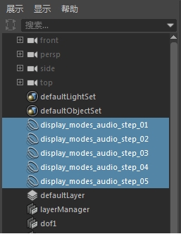 注: 若要在大纲视图中查看音频节点,请确保禁用“显示 > 仅显示 DAG 对象”(Display > DAG Objects Only)过滤器。
