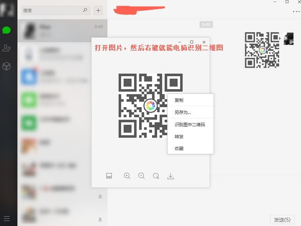 而最新版的微信目前已具备电脑端识别二维码的功能,当有人给你发送二维码时,仅需点开该二维码,然后再右键数遍,这样就可以轻松识别出来了。