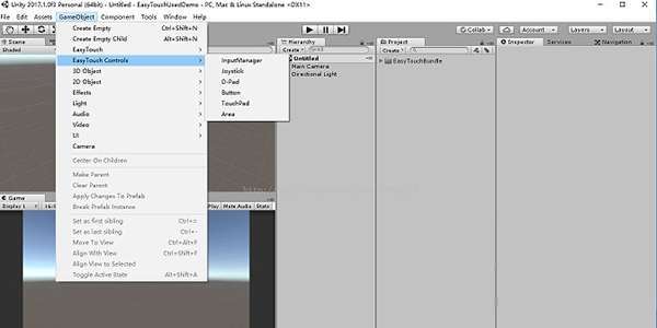 1、导入进项之后会在GameObject下拉菜单中出现相应的选项列表EasyTouch Controls,EasyTouch。