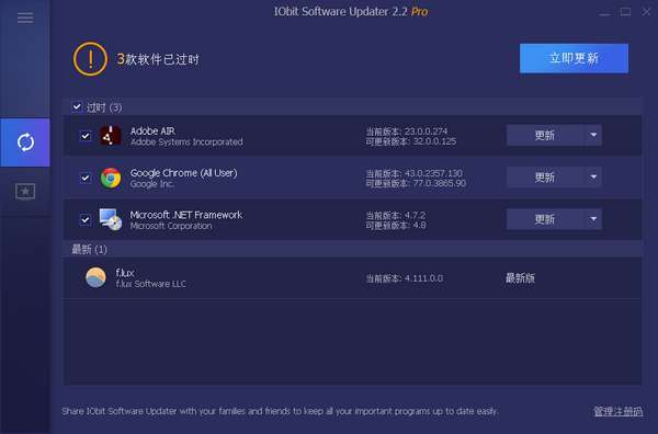 IObit Software Updater中文免费版是一种功能全新且实用的软件更新工具,软件可自动检测出电脑里老旧的软件,显示目前版本和最新版本,提供了最简单的方法来更新软件和安装基本程序,从而确保您享受所有新功能并保护您免受未修补的漏洞的侵害,使用户的软件保持最佳状态。