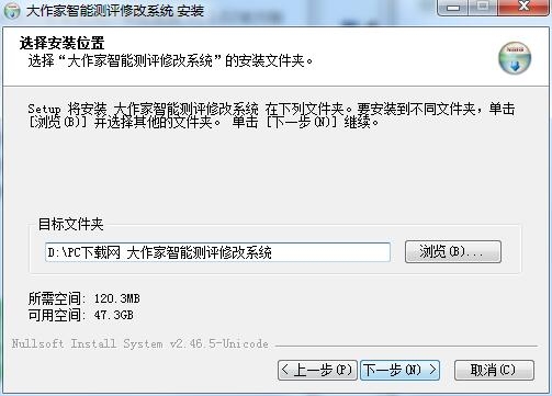 4、对该软件的安装位置进行选择,默认位置“C:Program Files (x86)大作家智能测评修改系统”,建议安装D盘,点击下一步继续;