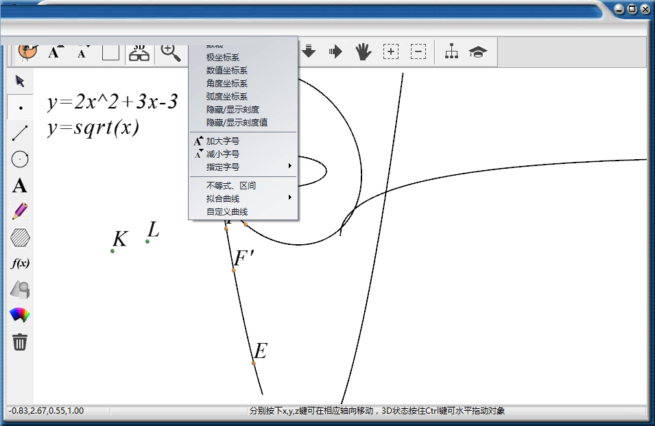 2、增加了平面解析几何的功能。能够方便的绘制如抛物线、椭圆、双曲线、正弦、余弦、正切、余切曲线,并且能够动态修改各种参数