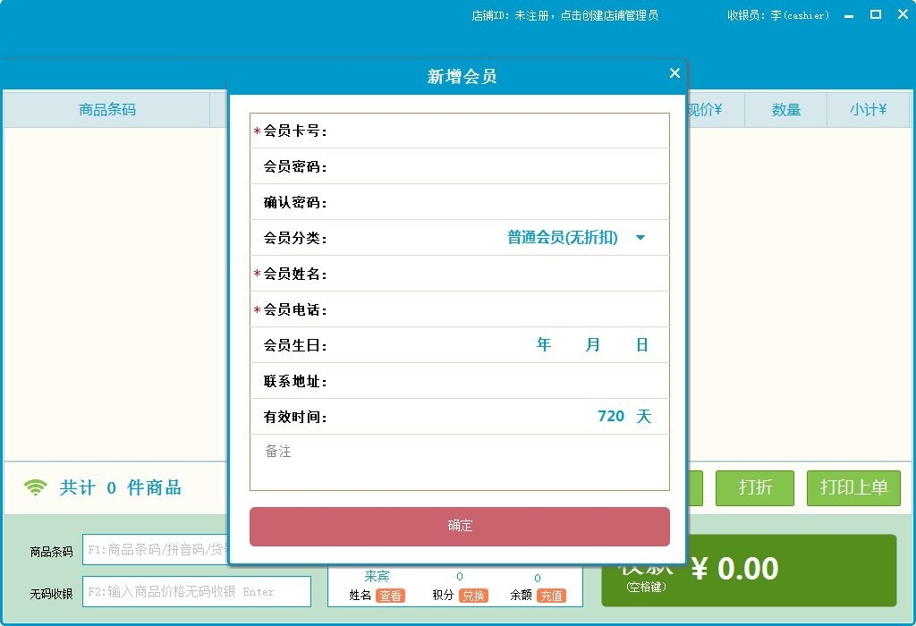 2、点击新增会员包括了会员卡号、会员密码、确认密码、会员分类、会员姓名、会员生日、联系地址、有效时间等;