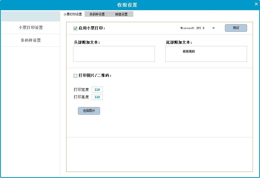 5、设置包括了系统设置、启用小票打印、头部附加文本、打印图片、二维码等;