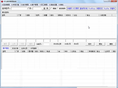 中为IC库存管理系统是目前市面所见最实用的一款IC库存管理软件,共分6大版权功能,适合做IC生意的公司使用。在首页搜索型号的同时可以查看客户来电询价记录、市场其他商家报价记录、销售出单记录,并可同时打开其他相关电子商务网站进行查看信息。
