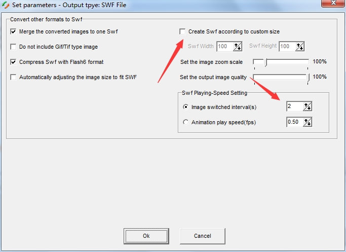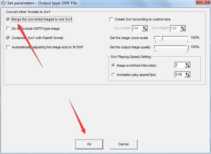 4、用户需要勾选第一个选项Merge the converted images to one Swf