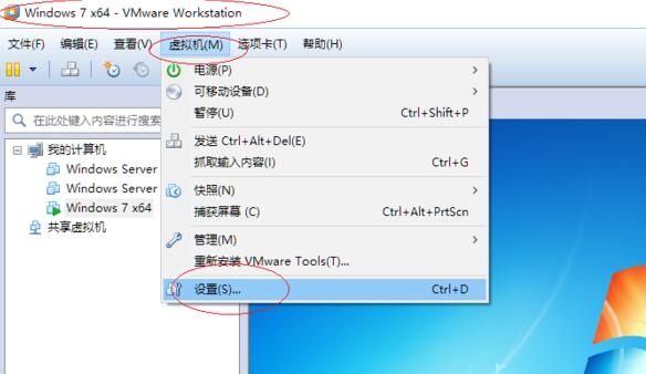 2、如图所示,唤出“Windows 7 x64”用户界面。选择菜单栏“虚拟机”标签,弹出下拉菜单点击“设置...”项