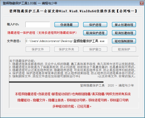登辉隐藏保护工具官方版支持隐藏进程,保护,强删,禁止创建,程序开发者必备。
