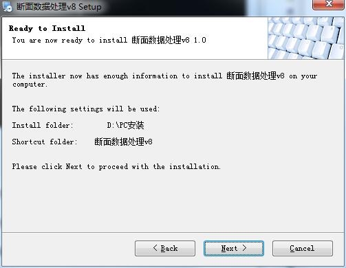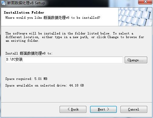 5、对软件的安装位置进行选择,默认位置“C:program Files (x86)断面数据处理v8”,建议安装在D盘,点击Next;