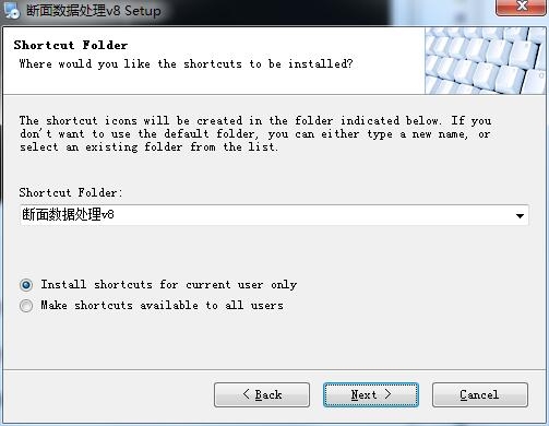 6、对菜单文件夹进行选择,默认文件夹“断面数据处理v8”,点击Next;
