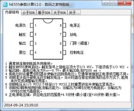 ne555参数计算器官方版是款针对ne555专门打造的参数计算工具。ne555参数计算器电脑版可以根据手中不同的设备参数,计算电路的频率和占空比,从而判断出电路是否合乎规范。ne555参数计算器让工作人员能够快速的掌握ne555的内部的设定,了解周边电路的设计,计算出频率和占空比。