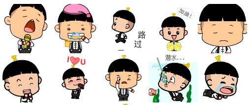 一个很可爱的小男孩儿,表情有唱歌,刷牙,路过,加油!打哈欠,鼓掌,iloveu,鬼脸,潜水,爬地上哭,站着哭,放炮,写字,舔棒棒糖,恭喜发财。