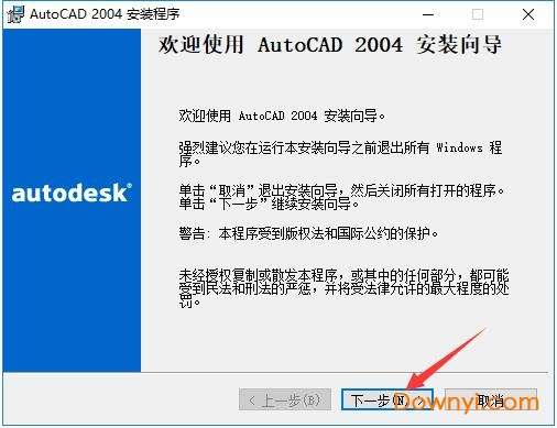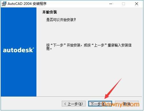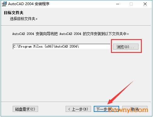8、选择autocad2004的安装目录。此处不建议安装在c盘,如果c盘文件过多的话,会影响计算机的运行速度。选定后点击“下一步”。