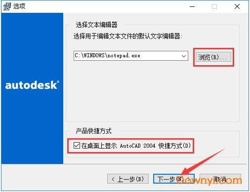 9、选择autocad2004用于编辑文本文件的编辑工具,一般情况下保持默认选择即可。然后根据需要选择是否添加autocad2004的桌面快捷方式,再点击“下一步”。