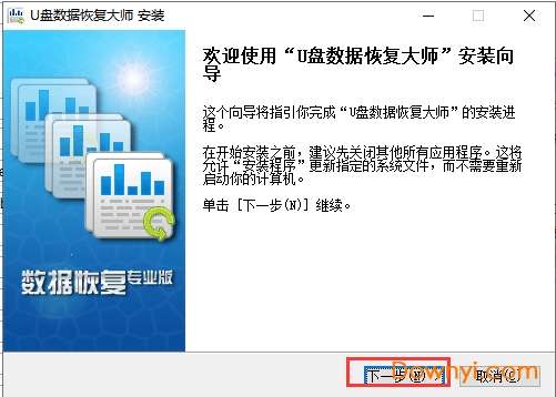 1、首先我们在本站下载u盘数据恢复大师官方版软件包,下载完成后我们解压得到exe安装文件,我们鼠标左键双击exe文件就可以进入到下图中的安装界面,我们点击下一步继续安装。