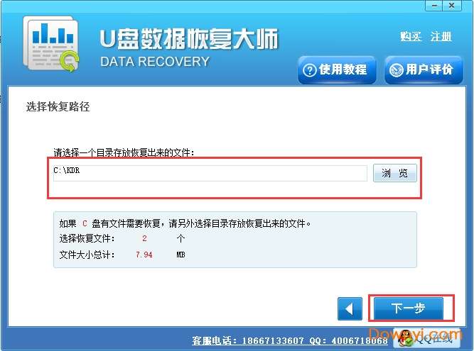 5、进入到数据恢复路径选择界面,我们需要选择合适的恢复路径,这里需要注意的是如果你要恢复的文件是c盘或者d盘的,那么要选择别的恢复目录,尽量不要放到初始的盘中。选择好之后我们点击下一步就可以开始恢复了,等待恢复完成就可以使用了。