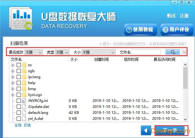 4、u盘数据恢复大师软件扫描完成后,我们就可以在界面中看到删除的文件了,我们选中自己要恢复的文件,然后点击下一步。