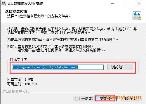2、进入到u盘数据恢复大师软件安装位置选择界面,如下图所示,我们可以点击浏览选择合适的安装位置。这里我们需要注意的是如果你要恢复的数据在c盘或者d盘中,那么我们需要将软件就不能安装到c盘或者d盘,需要安装到其他盘。我们设置完成后再点击安装。