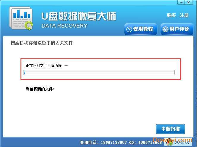 4、接下来u盘数据恢复大师软件会扫描u盘中丢失的文件,如下图所示,在界面中会显示当前找到的文件,这个扫描过程是需要一点时间的,我们需要耐心等待。