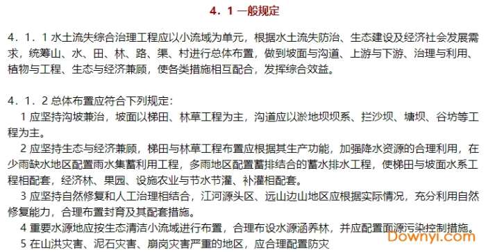 本规范共19章和3个附录,主要技术内容包括:总则,术语,基本规定,水土流失综合治理工程总体布置,工程级别划分和设计标准,梯田工程,淤地坝工程,拦沙坝工程,塘坝和滚水坝工程,沟道滩岸防护工程,坡面截排水工程,弃渣场及拦挡工程,土地整治工程,支毛沟治理工程,小型蓄水工程,农业耕作措施,固沙工程,林草工程,封育工程等。