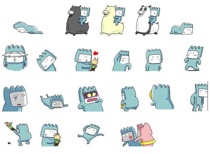 饺子头qq表情包,一个蓝色锯齿方头小人,表情有摇头,骑绵样,骑熊猫绵样,看牛郎织牛书,窘态,亲小兔,打架,学飞,学爬,骑黑绵羊,一口吃下饺子,偷菜啦!