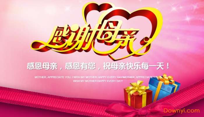 幻灯片模板封面使用了红色丝带与两个礼物盒作为背景图片,中间使用金色立体《感谢母亲》四个艺术字作为母亲节ppt标题。