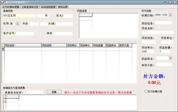 御风诊所收费系统正式版是款设计相当严谨专业,灵活实用的诊所收费管理工具,御风诊所收费系统正式版拥有丰富的功能,其可以进行门诊收费、处方打印,具有结账、记账、还款、抹零等功能模块,御风诊所收费系统还可以对收费进行汇总查询或按姓名查询等等。