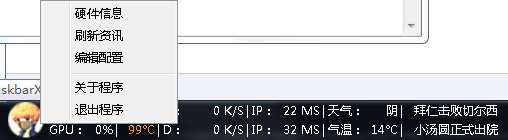 TaskbarX最新版是款非常优秀且又相当实用的任务栏工具,TaskbarX最新版采用人性化的设计思想,简洁的操作步骤,其用户能够快速的看到自己电脑的系统占用、温度、网络速率、IP延迟和今天的天气和新闻,TaskbarX操作起来十分简单,无需专业知识,即可使用。
