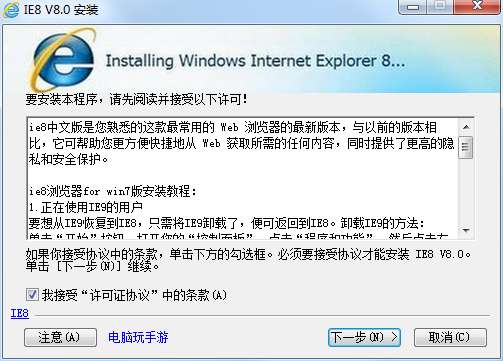 1、在PC下载网下载ie8.0浏览器的压缩包,解压后,双击exe文件,进入安装界面,查看软件许可协议,勾选我接受许可证协议中的条款,点击下一步
