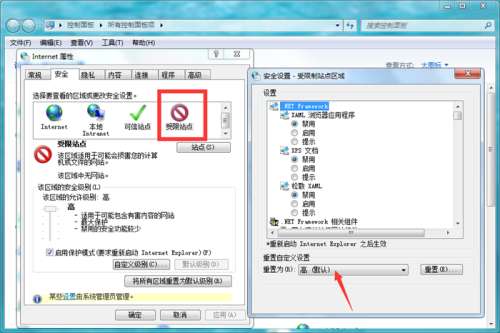 可信站点:如图所示,打开自定义级别,在设置列表中可以启用或者禁用一些功能,点击确定。