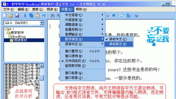 3、支持所有TXT、RTF格式中英文文本文件,及其它纯文本文件,无需定制文件格式,即可进行完美的中英文混合朗读。