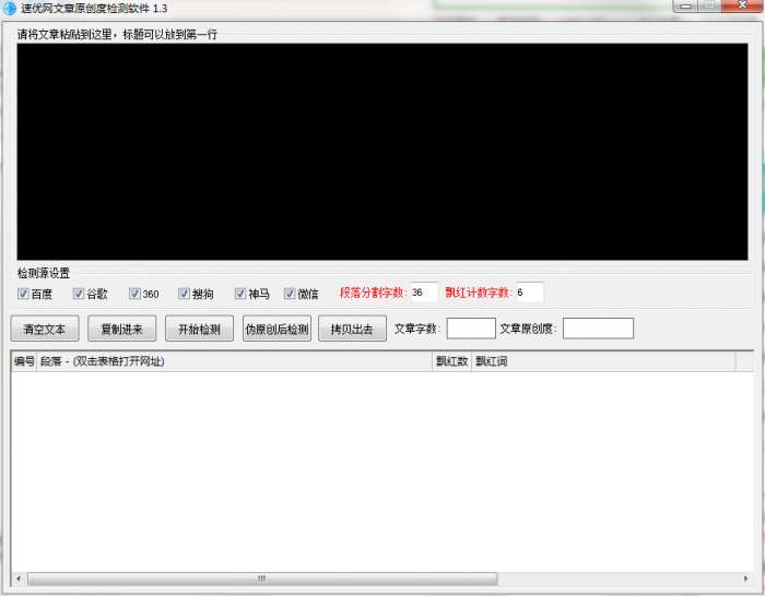 速优网文章原创度检测软件官方版是一款利用搜索引擎来检测文章原创度的软件。速优网文章原创度检测软件最新版支持所有国内引擎百度360谷歌等,写伪原创文章可以检测,做到最大程度的搜索引擎优化。速优网文章原创度检测软件官方版还支持自定义段落分割字数,同时支持统计飘红字数。