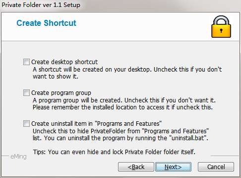 锁定文件夹:锁定文件夹后,知道路径也不能够访问,只会跳出“无法访问,访问拒绝”字样的窗口。只有在Private Folder中解锁后能够打开。