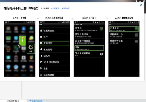 3、 检查您是否有开启了【USB调试】功能,如果您对开启方法不清楚也不要着急,请参考下图。