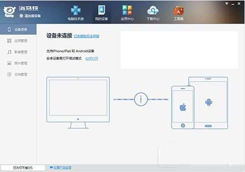1、在海马玩界面中,点击我的设备,连接手机,即可在线传输文件等更多功能。